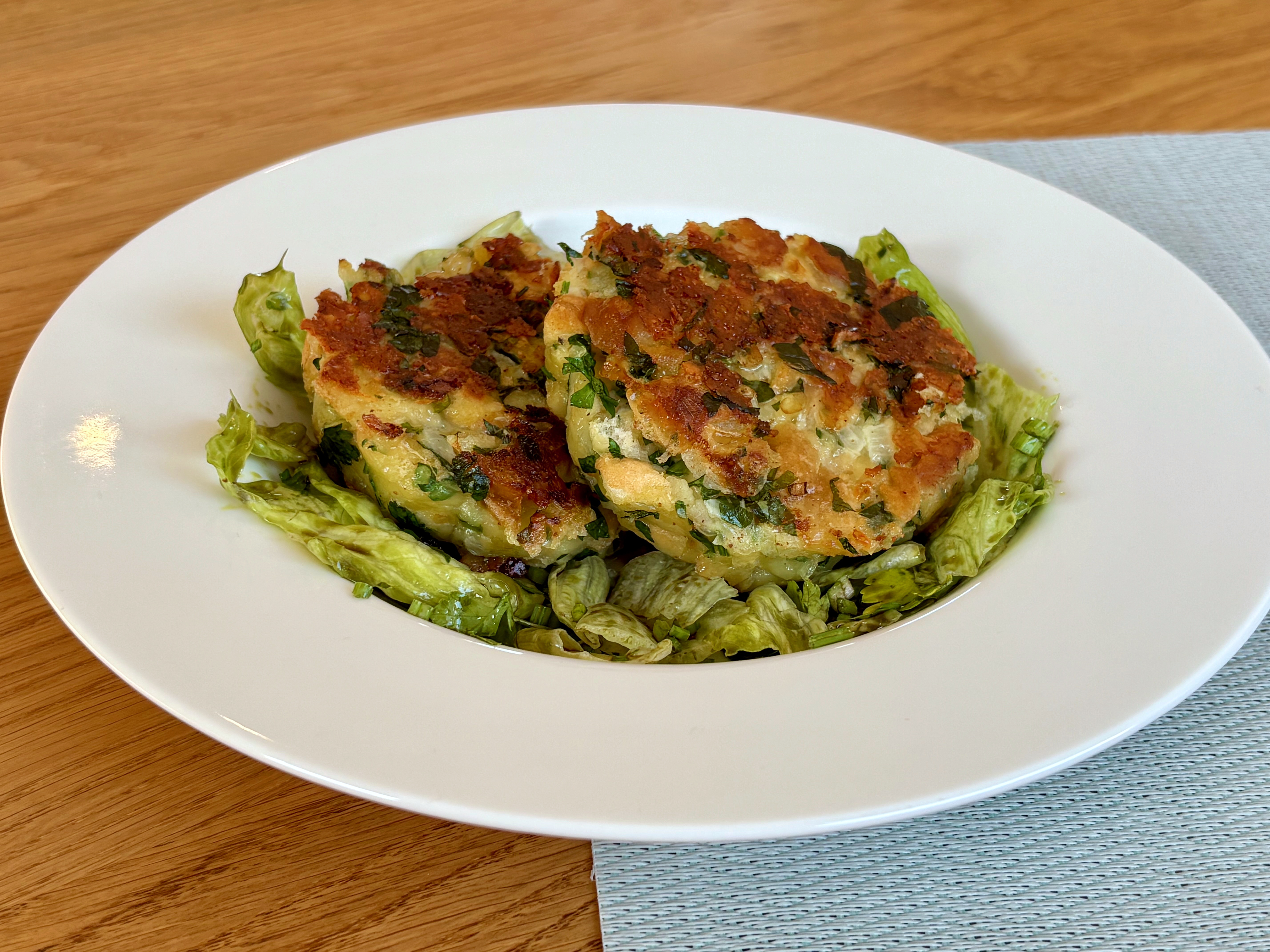 Aus der Masse die typisch flach gepressten Knödel formen. In ordentlich Butter und Olivenöl auf beiden Seiten goldbraun anbraten. Zum Salat oder als Suppeneinlage servieren. Mahlzeit!